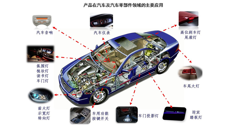 配合汽車內室燈光的需要,提供全色系、全尺寸的LED解決方案,應用于影音娛樂終端、空調控制器、儀表顯示、各類功能型按鍵開關、情景氛圍燈等